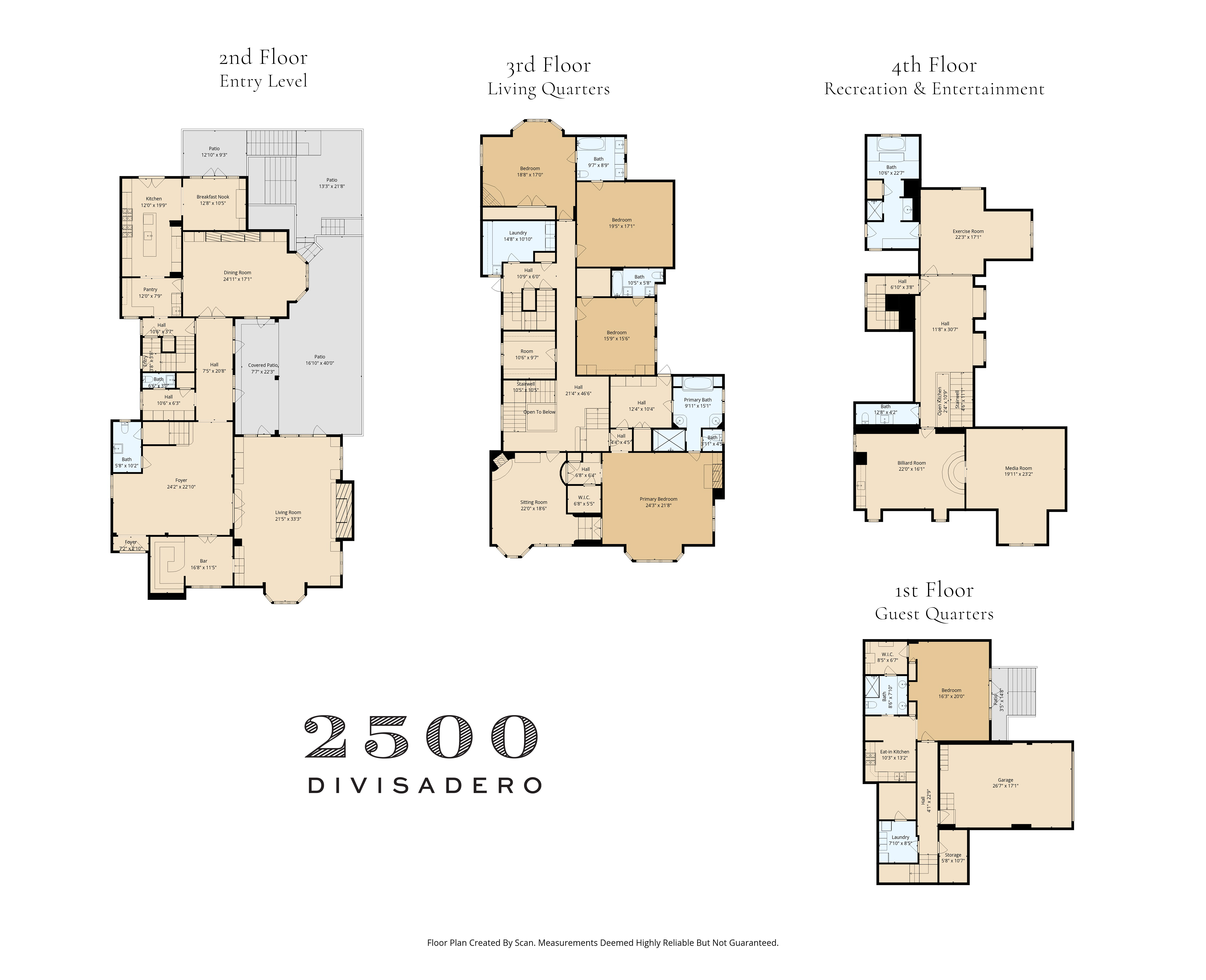 The top floor is designed as an inviting destination for leisure and entertaining, offering a series of richly appointed spaces including a wood-paneled library and banquet hall, billiards room with bar, media room, and a flexible gym or guest suite with full bath. On the lowest level, a separate apartment with independent access from both the grounds and garage provides ideal accommodations for guests or staff.